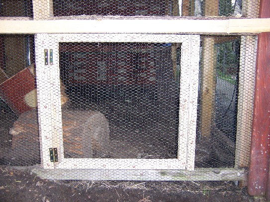 Da man das Gehege ja auch mal saubermachen muss, wollten wir noch eine Tür einbauen. Da das Gehege nur 1,20m hoch ist würde sich auch ein klappbarer Deckel anbieten. Da in unserem Fall die Kaninchen nur in den Gehegeteil kommen, wenn der Rasen schön hoch gewachsen ist und sie danach wieder in den großen Teil wandern (während der Rasen nachwächst), reicht uns eine kleine Tür. Wie auf dem Foto zu sehen ist, wurde sie mit 2 Scharnieren befestigt und hat an der Außenseite einen Riegel.
