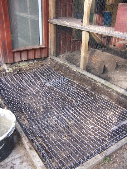 Auf die Erde kommt nun ein Gitter, welches extra bei Betonierungen eingesetzt wird. Der Sinn hierin ist, dass der Beton später nicht reißt. Man nennt das ganze deshalb auch „Stahlbeton“.