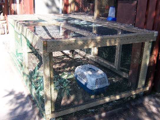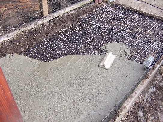 Ein Jahr später, diesmal bei mir selbst im Garten, sollte wieder ein Gehege gebaut werden. Diesmal größer, circa 16m² groß. Wir entschieden uns diesmal eine Betonsohle zu gießen und den Draht darin zu befestigen. Diese Variante kostet zwar mehr, ist aber sicher. Auf diese Sohle kamen circa 30-40cm Erde. Die Kaninchen können nun graben (und das tun sie wie verrückt), kommen aber nicht raus.